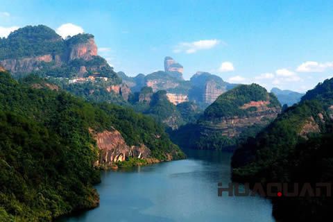 在丹霞山地區,由于風蝕作用,厚達300~500米的巖層在流水、風力等的長期作用下,逐漸形成了堡壘狀的山峰和峰叢,以及千姿百態的奇石、石橋和石洞。1928年,正在丹霞山考察的馮景蘭意識到這是一種 地貌景觀,并把形成丹霞地貌的紅色砂礫巖層命名為丹霞層。而“丹霞”一詞源自三國曹丕的《芙蓉池作詩》,“丹霞夾明月,華星出云間”,指天上的彩霞。丹霞山景區的陽元山,因有陽元石而得名。陽元石是一個酷似男性生殖器的天然石柱。據專家考證,該石柱從旁邊的陽元山剝離已經有30萬年歷史。被譽為“天下 奇石”、“天下 絕景”。通泰橋為景區內的天生石拱橋,跨度為38米,拱高15米,翔龍湖景區位于長老峰南側,因湖面輪廓酷似一條騰飛的青龍而得名,沿湖有龍角山、龍須洞、九龍峰、仙居巖道觀等景點20多處,山崖直有古今龍文化石刻。湖尾不遠處還有一個酷似女性生殖器的天然石洞——陰元石。陽元石與陰元石一起被稱為“丹霞雙絕”。